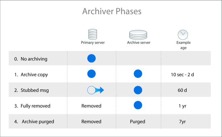 Archiving solutions have different stages to process the email data. Below the four stages of the archive process are described.