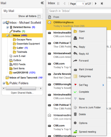Figure 3.9, “Context menu from a mail message”) shows the context menu that shows up when clicking with the right mouse button on an email. Through this menu most copy, move and delete operations are performed. It also is possible to download a message as a file.