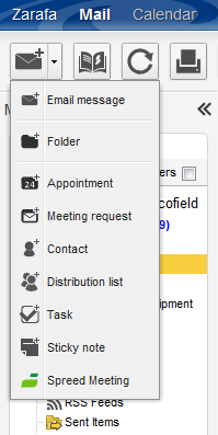Nadat je ingelogd bent, zijn alle Outlook mappen en de publieke mappen waarop je account recht heeft beschikbaar. De meeste basisfunties zijn beschikbaar vanuit de WebAccess werkbalk. Deze vind je aan de bovenkant van de paina. Zie ook Figuur 2.2, “Het menu "Nieuw"”.