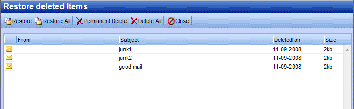 When deleting an item in the Deleted Items folder or the Junk Email folder, the item is still temporarily recoverable. Select the Deleted Items folder or Junk Email folder, and use the button Restore Item in the bar at the top. As shown in Figura 2.4, “The soft delete restore window” it is possible to restore all or a selection of the deleted messages or folders. The restored items will be moved to the old location. Deleting items from Figura 2.4, “The soft delete restore window” removes them permanently — in that case only backups can recover an item. When restoring a folder, only that folder will be restored. If the restored folder contained subfolders, these can be restored by selecting the just restored folder and clicking on the Restore Item button again.